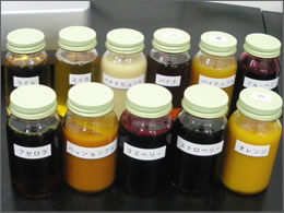 Though the samples are all fruit juices, there are some that are murky while others are clear with no pulp. Also, there are many different types of clear juices, such as those with darker tint and those that are completely transparent.