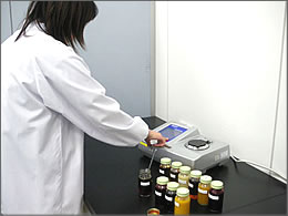 At the QC lab, we collect fruit juice with a spatula and place it on the sample stage of the RX-5000a, taking measurements one after another.